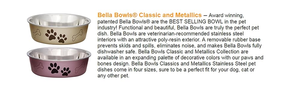 • Los cuencos Bella son los cuencos más vendidos en la industria de mascotas y por una buena razón. Funcional y hermoso, los cuencos Bella son realmente el plato perfecto para mascotas. Loving Pets da nueva vida a los cuencos de acero inoxidable recomendados por veterinarios para perros y platos de alimentación de mascotas combinando un interior de acero inoxidable con un atractivo exterior de poliresina. Una base de goma extraíble evita resbalones y derrames, elimina el ruido y hace que los cuencos Bella sean totalmente aptos para lavavajillas